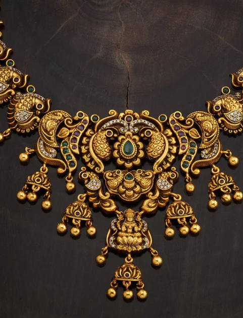 The best way to be the showstopper on all occasions is to wear accessories that catch everyone’s attention, like our latest antique necklace and earrings set. One look at this set will make you realize that you need it for this wedding season, thanks to its elegant Jhumkas that complement the heavenly Goddess and peacock motifs on the necklace.