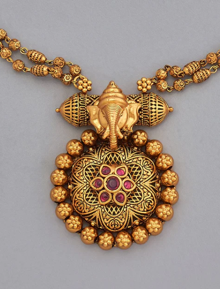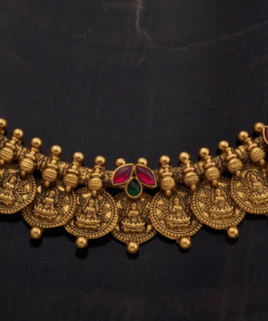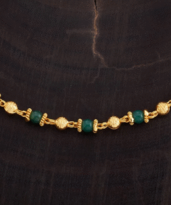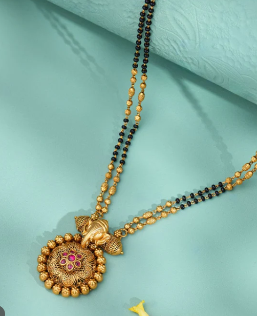 Add a touch of traditional elegance to your ensemble with the antique mangalsutra, a symbol of marital bliss and cultural heritage. Crafted with intricate detailing and adorned with sparkling ruby stones, this gold-polished mangalsutra is perfect for adding a touch of tradition to your bridal ensemble or everyday attire with grace and style.