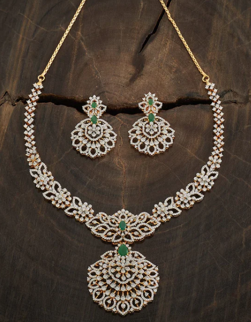 Elevate your evening attire with this stunning zircon necklace. Featuring a short design with a striking central pendant adorned with green zircon stone, it comes with matching hanging earrings. The rhodium- gold polish adds a modern touch, making it perfect for both traditional and contemporary outfits.