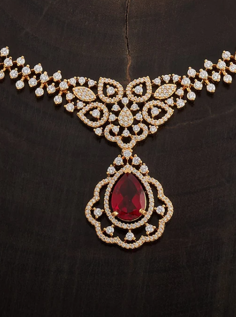 Elevate your evening attire with this stunning zircon necklace. Featuring a short design with a striking central pendant adorned with green zircon stone, it comes with matching hanging earrings. The rhodium- gold polish adds a modern touch, making it perfect for both traditional and contemporary outfits.