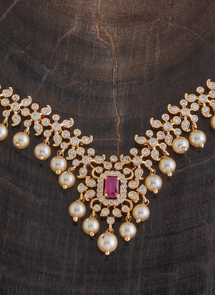 This shaadi season, match this elegant zircon necklace with your outfit to make the heads turn. Adorned with ruby, green, or white stones and beads, this short necklace has timeless golden polish. Complemented with push-back hanging zircon earrings, this set makes you look elegant and classy everywhere you go.